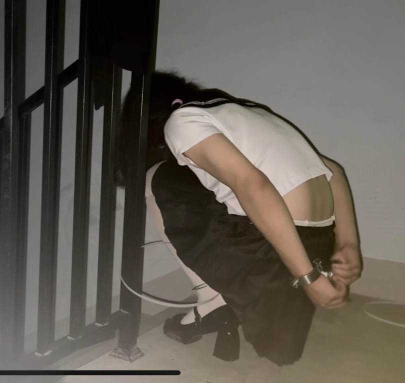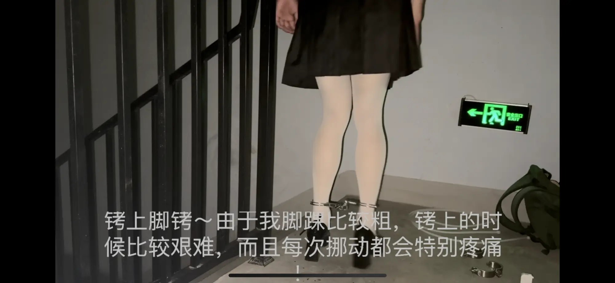 这次是在小区楼道里自缚!用两副手铐和一个定时锁,再用扎带把活动范围限制在这一小块地方内。先把黑丝脱掉换成白丝,然后铐住双脚(这个本来就是手铐,用它来铐我的脚踝非常勒得慌,稍微动一动就会很疼!!),然后用扎带和栏杆连接在一起,最后再用定时锁定号时,把两个手铐连接在一起,反手铐住双手后就再也没有回头路了,只能等定时结束之后再解缚,如果定时所出问题的话,真的一点办法都没有,这个距离我也够不到放在一旁的包里面的钥匙!!