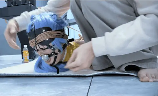 场景1:金属马具口球+眼罩,绑一个极限抬头驷马,绳子连接马具口球和高跟鞋强制抬头,连鞋跟、脚掌都绑在一起。让冬儿身体被迫反弓,真正的动弹不得~后面还戴上了三向鼻钩 ,鼻涕口水流的脸上到处都是,哪怕崩溃大哭也因为极限驷马的原因只能在动弹不得的情况下崩溃~
