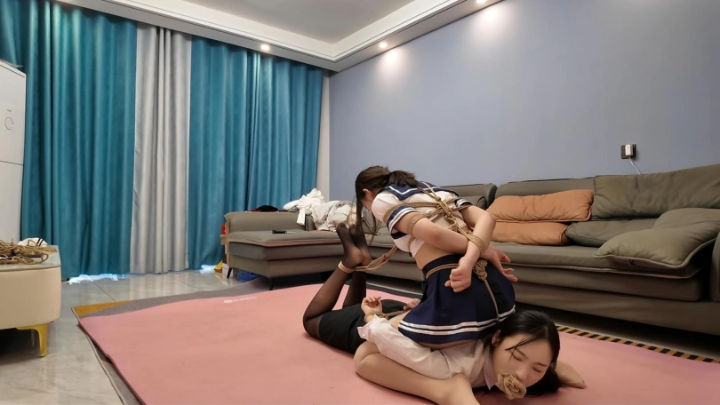 晓琴放学刚进家门,就被早已埋伏的小样持刀逼着,捆绑起来,带上口球,又绑成驷马,踩踏,玩弄,没想到螳螂捕蝉,黄雀在后,小样正在玩弄晓是时候,突然窜出了一名男子,持刀把小样控制,接着把两个人上下捆绑起来,又用丝袜把她们两个嘴堵住...