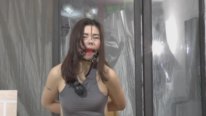 少妇媚儿,穿银色泳装+肉色舍宾丝袜,被勒嘴、封嘴、蒙嘴、口球、鼻钩,挣扎逃脱失败,手雷挂胸前……