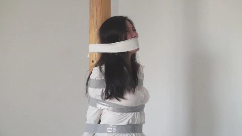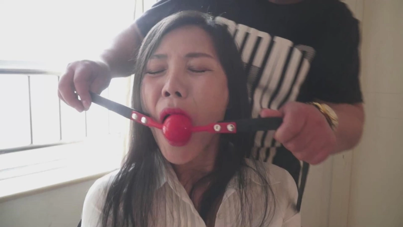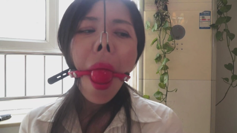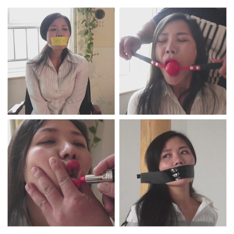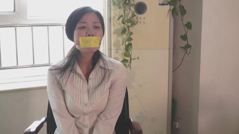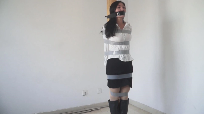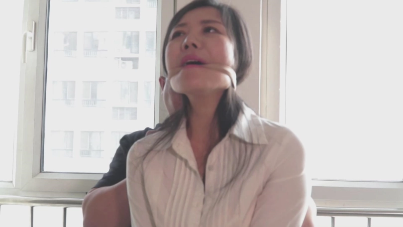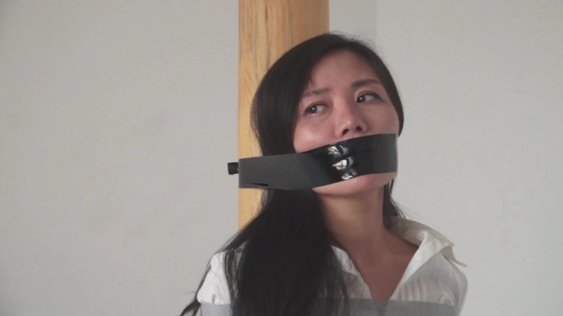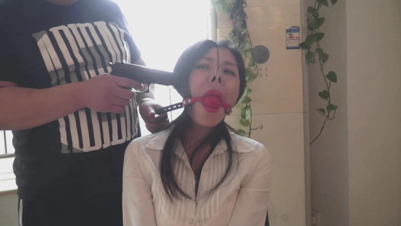 女井林静化身肉丝袜OL被歹徒持枪挟持。丝袜勒嘴、胶带封嘴、抚摸丝袜腿。之后又捏开林静的小嘴,帮林静涂口红。接着又是口球鼻钩。而后歹徒又将林静换上一双长靴,绑在柱子上,胶带封嘴、白布蒙嘴。