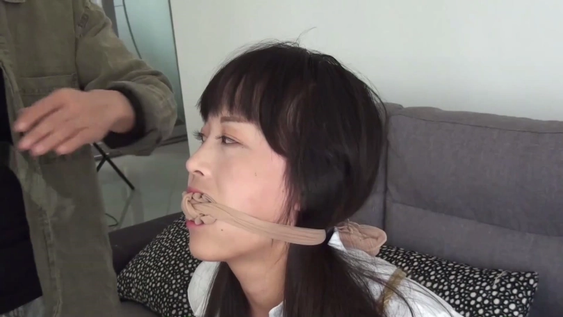 片段1:模特亚男被一双肉色连裤丝袜和一双肉色短丝袜塞嘴,再用一条肉色连裤丝袜勒嘴,嘴外被透明胶布封住,外面再用黑色静电胶带和白色纱布缠绕封住。