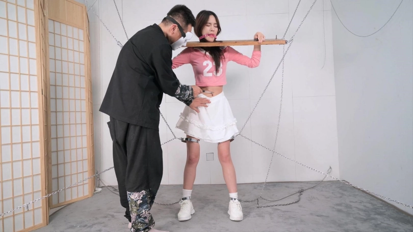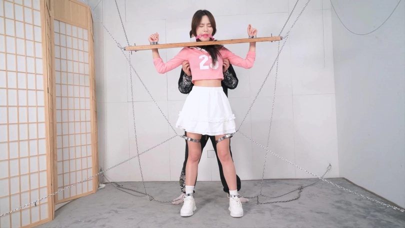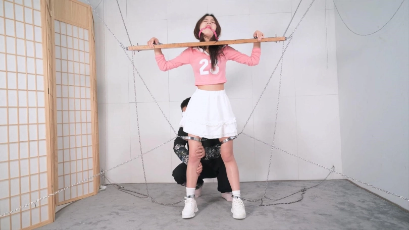 这个红色的足球宝贝的衣服本来是上衣加短裤,言妍自己搭配了一件学生气质的百褶裙,她这样一搭配,穿在她身上毫无违和感,加上白棉袜和加绒的运动鞋,这气质立马就出来了,把木枷吊起,腿上用了大腿铐,脚铐也用两根铁链限定了活动范围,言妍只能很小范围活动身体,这样放置简直太养眼了,经过TK、刺轮和电击器的攻击,她的呻吟声也激发出来了,对,就是我们喜欢的那个调调,又是声画俱美的片子!
