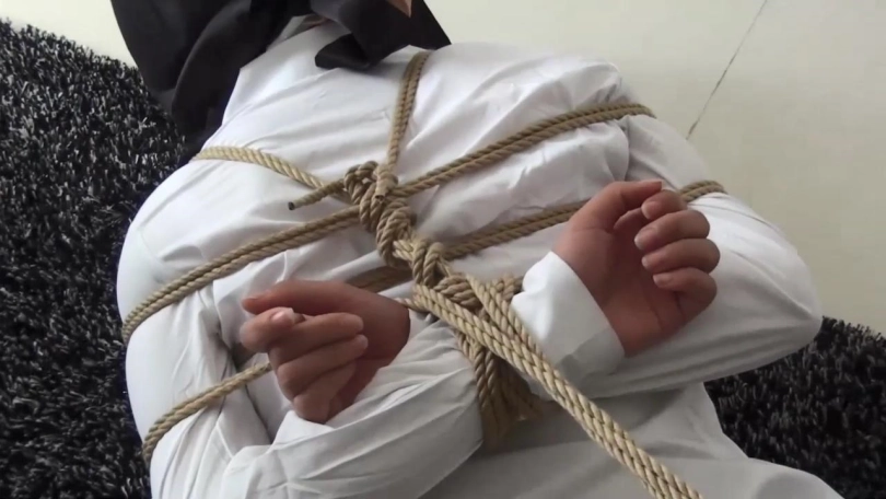 亚男经过艰难挣脱,终于挣脱束缚,解除套头塞嘴封堵,拽出口中湿润的丝袜大口喘气。