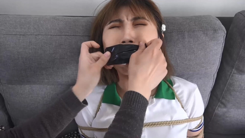 劫匪拿黑色胶布、黑色胶带、黑色自粘绷带缠绕封住阿琳的嘴巴,还把她驷马捆绑放置在沙发前地上,故意给阿琳拍照加以羞辱。