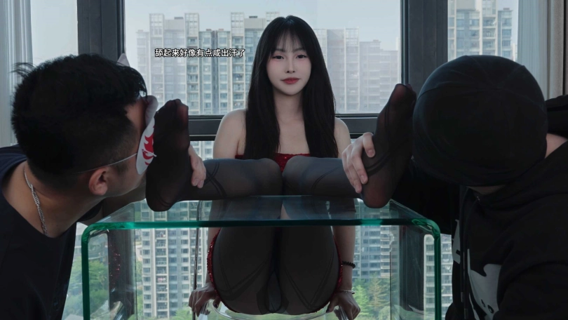 脚上穿着性感的涞觅黑绷带丝袜和长靴,跟我们说她是第一次体验这种。