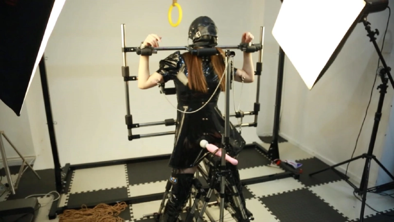 【四季屋】黑色乳胶衣 双玩具 郊狼拘束架!模特直骂人很有看点!