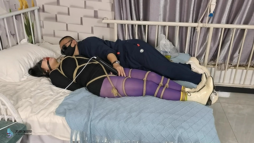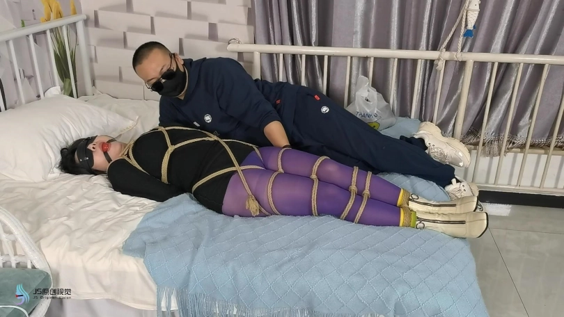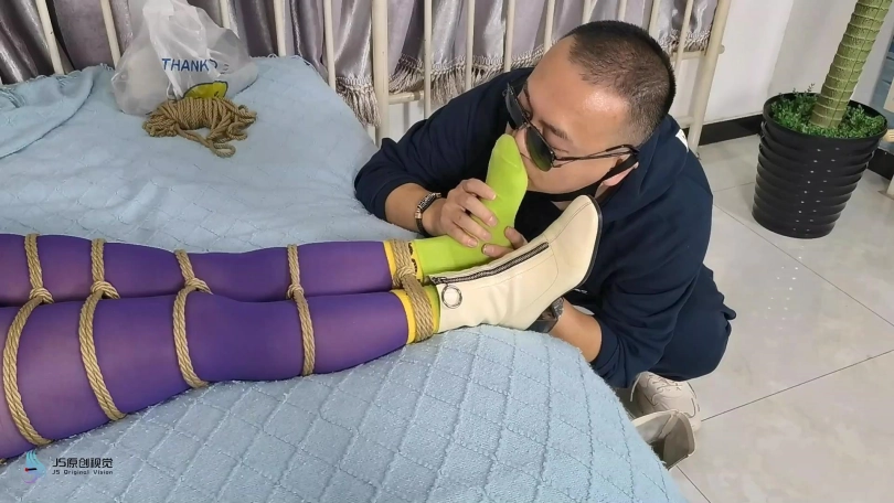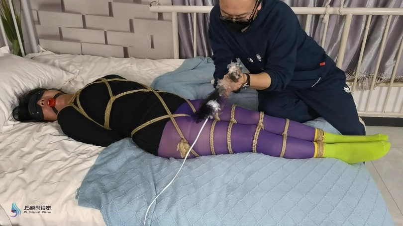 一个老女人还打扮的臊里臊气的,这天她在家门前散步,被一个男人盯上。男人偷偷的记住了她的房间号。第二天男人趁女人不在家悄悄潜入藏了起来。女人回来后,男人趁着女人不注意从身后抱住她,并捂住她的嘴巴向后拖走。当画面再次亮起时,女人全身已经被绳子紧密束缚躺在地上挣扎,她的嘴里被塞着口球,戴着眼罩。男人走来用鞭子抽打着她。把她放到床上,脱去女人的靴子,贪婪的闻着女人的靴子。男人开始挠女人的棉袜脚底,女人不断的挣扎。然后男人让女人用双脚足胶。并用棒棒不断刺进着女人的下面。很快女人达到GC。男人扶起女人准备换个花样玩弄她。