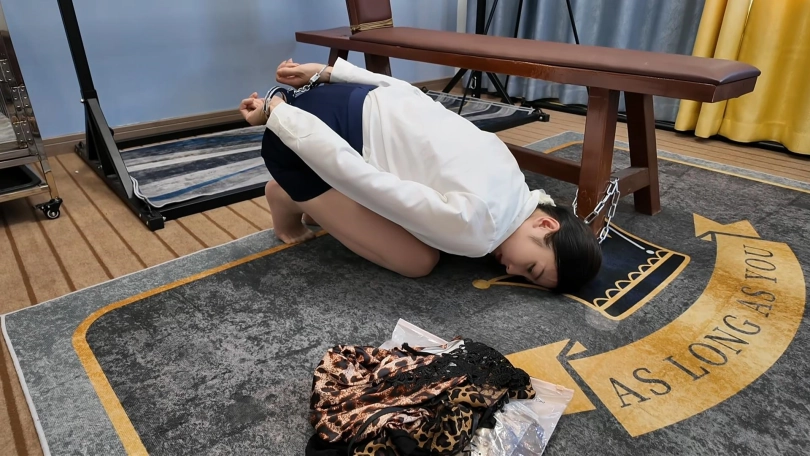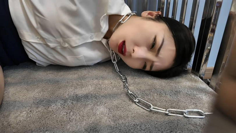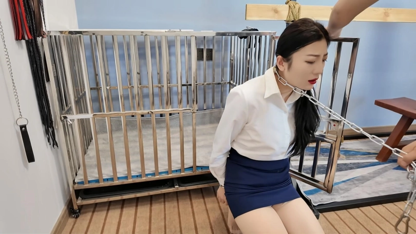 公司白领佳佳在家沙发上休息,被入室歹徒绑架折磨,绑到椅子上面墙高,多次墙高之后又把她关到笼子里面,带上铁链,拴到凳子上,最后逼迫她换上豹纹裙子开始下一轮的折磨