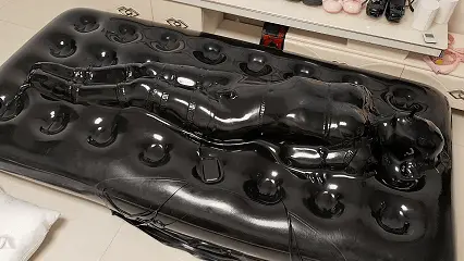在一阵子忙碌之后也是被送进真空床狠狠吸紧调教了,双重的束缚和剧烈的挣扎,不断用棒棒按摩,不知道里面会流成什么样子呢?