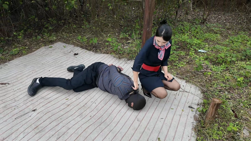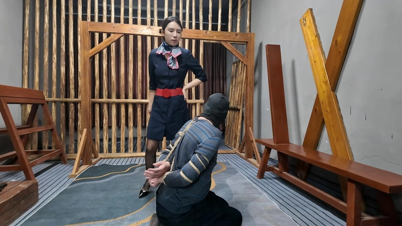 女侦探十一化妆成空姐,抓捕逃犯,在树林里发现逃犯张三在树后面躲藏,抓捕后五花大绑,押解到刑房审讯,皮鞭,高跟鞋,骑脖子,耳光、各种羞辱惩罚不断,最后押解到刑场执行枪决