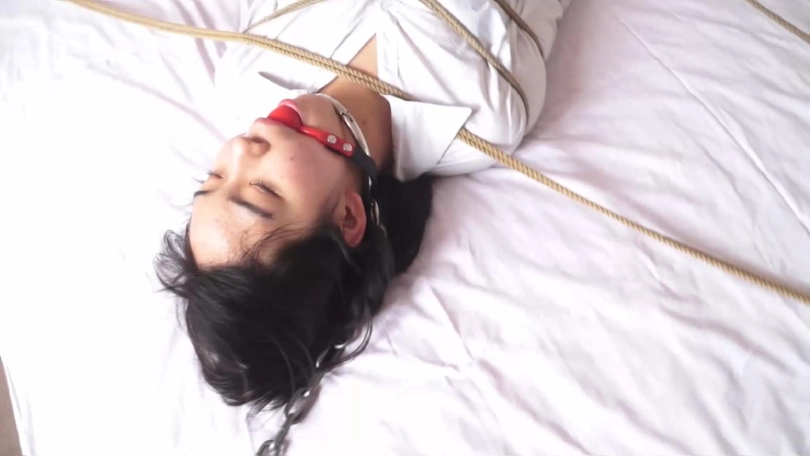 模特双臂被绑在身旁,双腿交叉被绑,口球封口。再用锁链捆绑,带上项圈限制在床上,动弹不得......