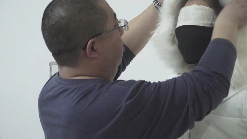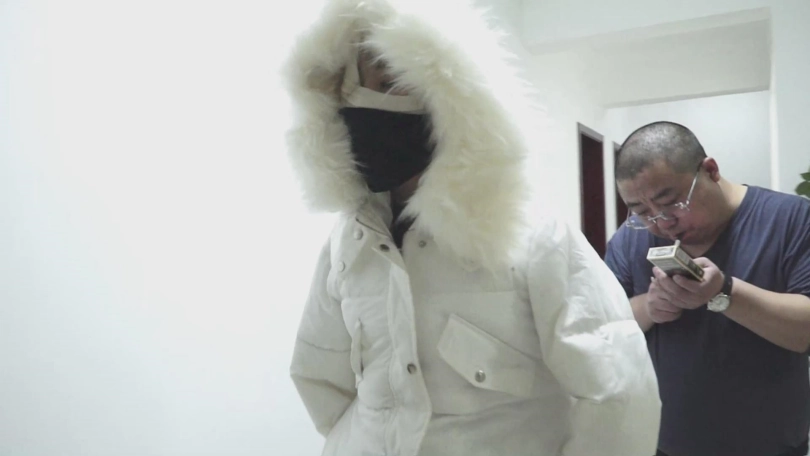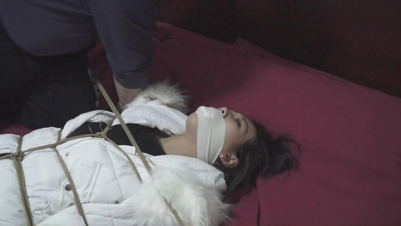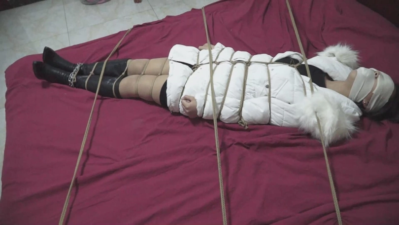 弄好了以后,屌丝男把美女的羽绒服脱了,然后把上身绑的很紧,腿不绑,再穿上羽绒服,两个空袖子塞到口袋