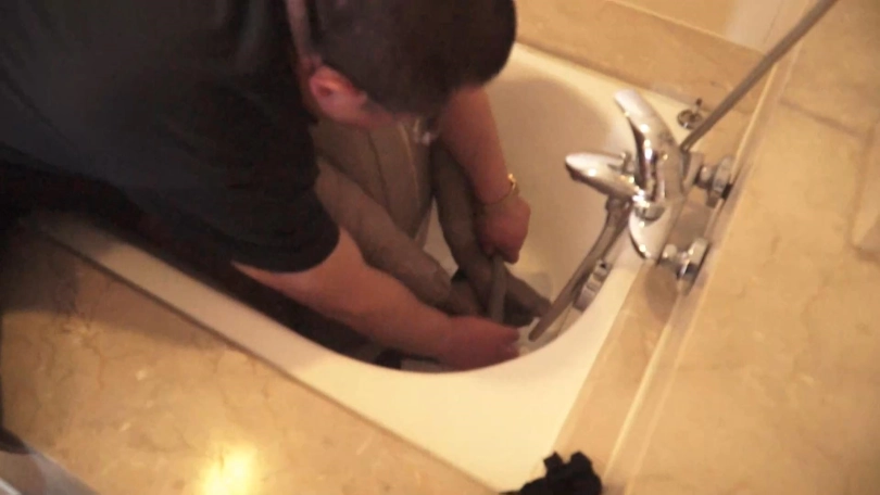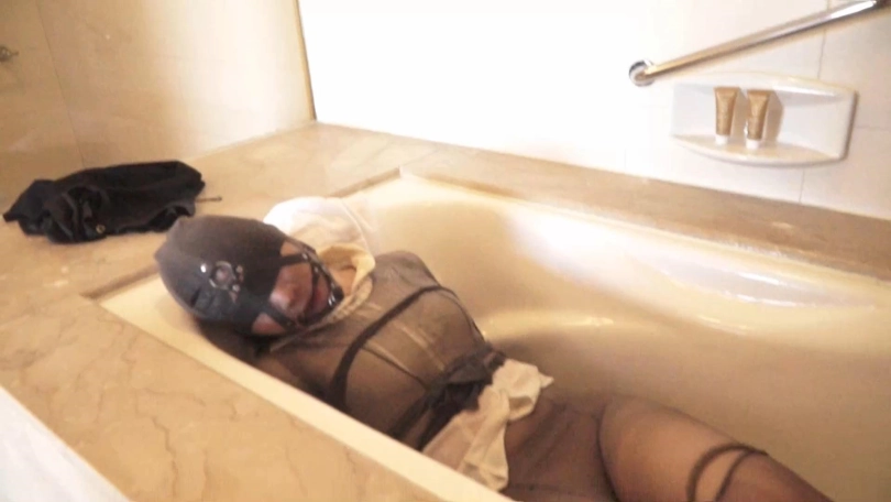 神秘人把小涵抱进旁边的浴缸,解开小涵的勒嘴,为她带上马式口球,用灰色丝袜套头。再解开双脚处的胶带和绳子,将双脚交叉重新绑好。脱掉小涵的短裙,用丝袜包住她的双腿和双臂,再用丝袜驷马捆绑起来。